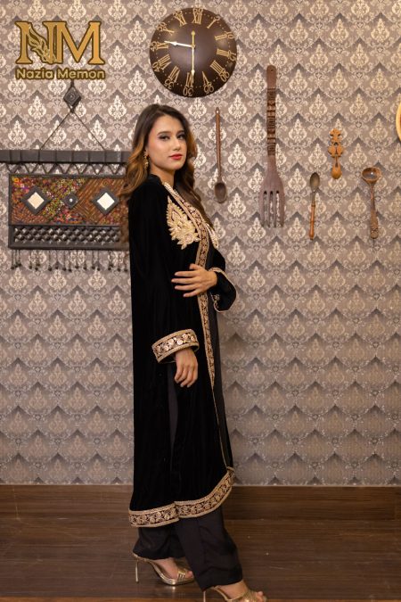 Be the first to review “Cape Style Black Velvet Top Paired With Jamawar Trousers -2PC”